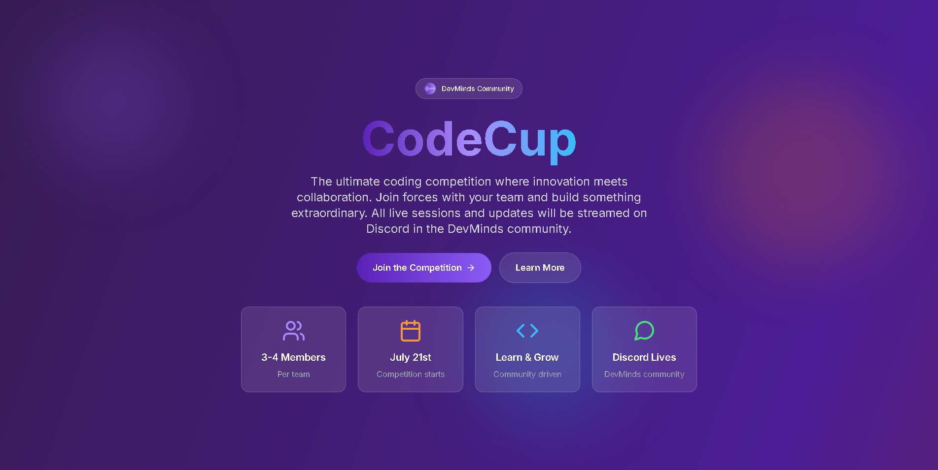 A beautiful, animated landing page for the CodeCup coding competition organized by the DevMinds community.
